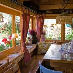 Salon otwiera się na piękną werandę, na której wypoczynek w otoczeniu przyrody ogrodu lub wspólne posiłki latem są prawdziwą przyjemnością. Dodatkowo, obok domków zbudowaliśmy szałas do grillowania, tarasy na letnie stoliki i wspaniały plac zabaw dla dzieci.