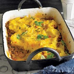Cebulę, marchew i seler pokrój w małą kostkę, czosnek drobno posiekaj. Oderwij listki oregano z gałązek. Rozgrzej masło w brytfance i przesmaż mięso na rumiano. Wyjmij i odstaw, na ten sam tłuszcz wrzuć warzywa. Smaż 10 minut na małym ogniu. Dodaj zrumienione mięso i przecier pomidorowy, smaż jeszcze 3 minuty. Dolej wino, bulion i sos worcestershire, dorzuć liść laurowy i połowę oregano. Przykryj i duś na małym ogniu 45 minut. Ziemniaki obierz i ugotuj. W garnku rozgnieć je z mlekiem i startym serem (zostaw 2 łyżki) na purée. Wyłóż mięso do naczynia do zapiekania, przykryj warstwą purée i posyp resztą sera. Piecz w rozgrzanym do 200ºC piekarniku przez 25 minut. Posyp resztą oregano.