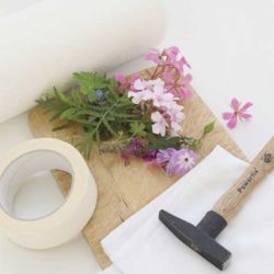 Najpierw układamy kompozycję, pamiętając, by rośliny przylegały do tkaniny „prawą stroną”. Teraz ostrożnie taśmą przyklejamy główki kwiatów i liście do materiału. Przykrywamy całość arkuszem papieru i niezbyt mocno, ale bardzo dokładnie „przybijamy” nasz zielnik młotkiem. Gdy delikatnie odkleimy kawałki taśmy – na płótnie pozostanie roślinny „stempel”.