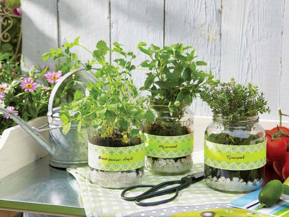 Ogródek ze słoikami w roli doniczek.